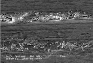 SEM Image showing IF-WS₂ nanoparticles accumulating in the valleys of rubbed surfaces of metal disks